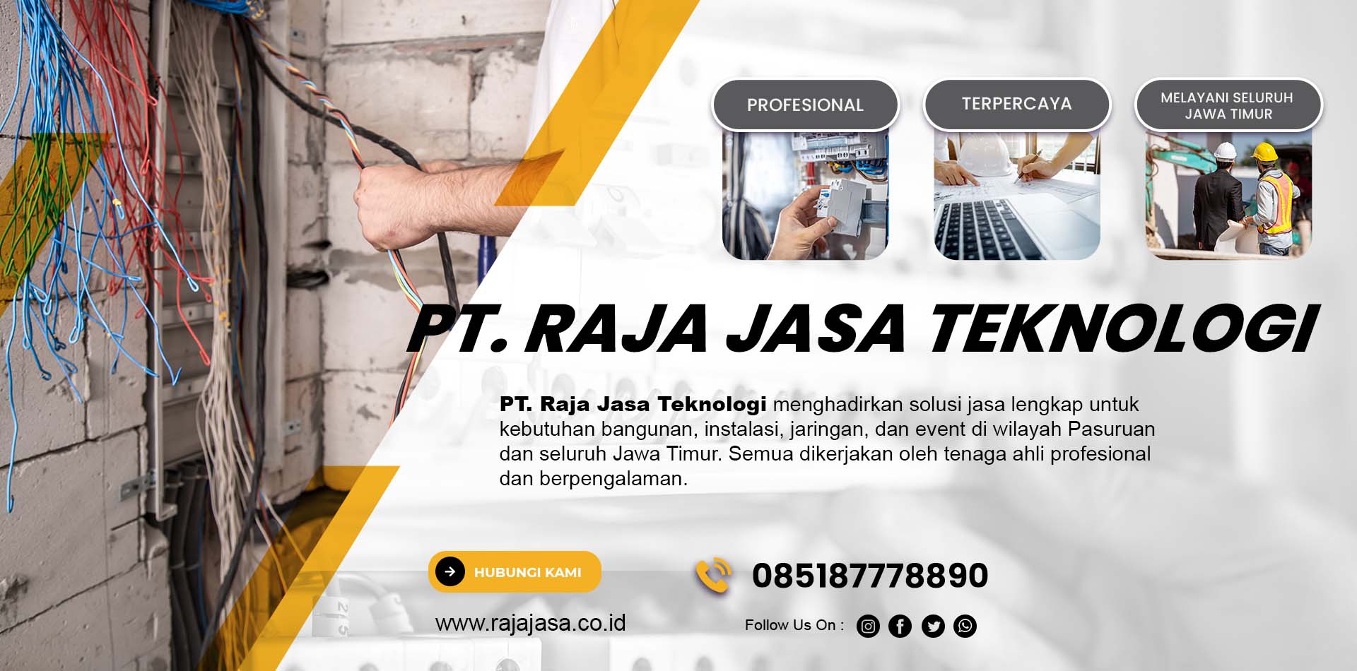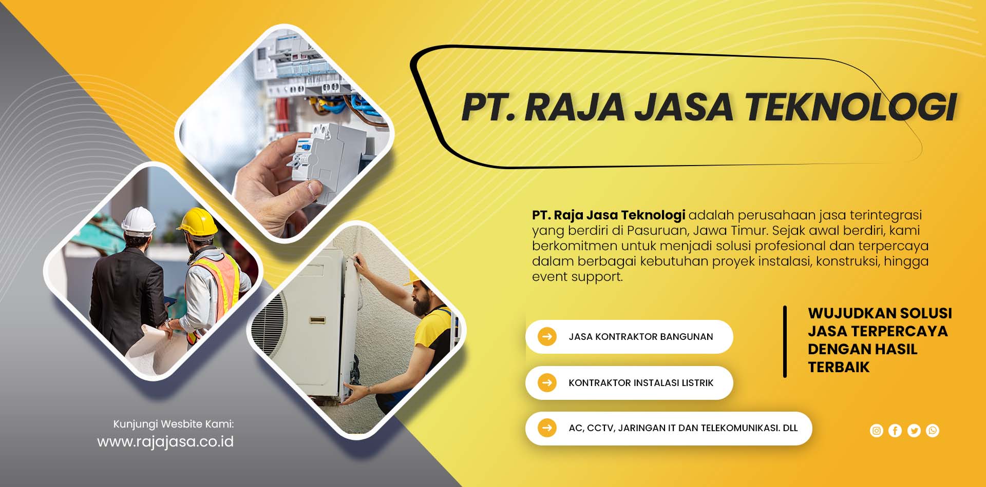 PT. Raja Jasa Teknologi Pasuruan melayani jasa kontraktor bangunan, instalasi listrik, AC, CCTV, jaringan IT dan telekomunikasi, serta sewa alat pesta.